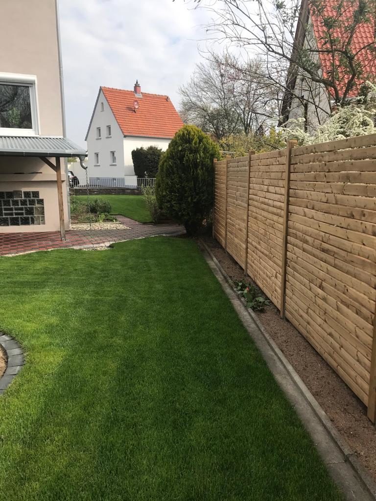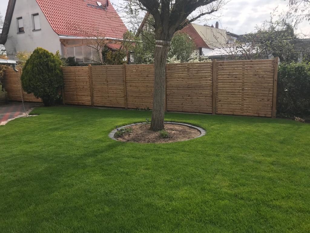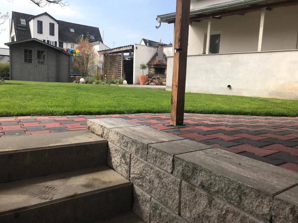 Hier wurde nach Kundenwunsch eine Kellertreppe aus Blockstufen hergestellt mit Treppenwangen aus Delgardo Mauersteinen, Rollrasen verlegt, ein kreisrunder Einfass um den Baum gepflastert und Sichtschutzelemente montiert.